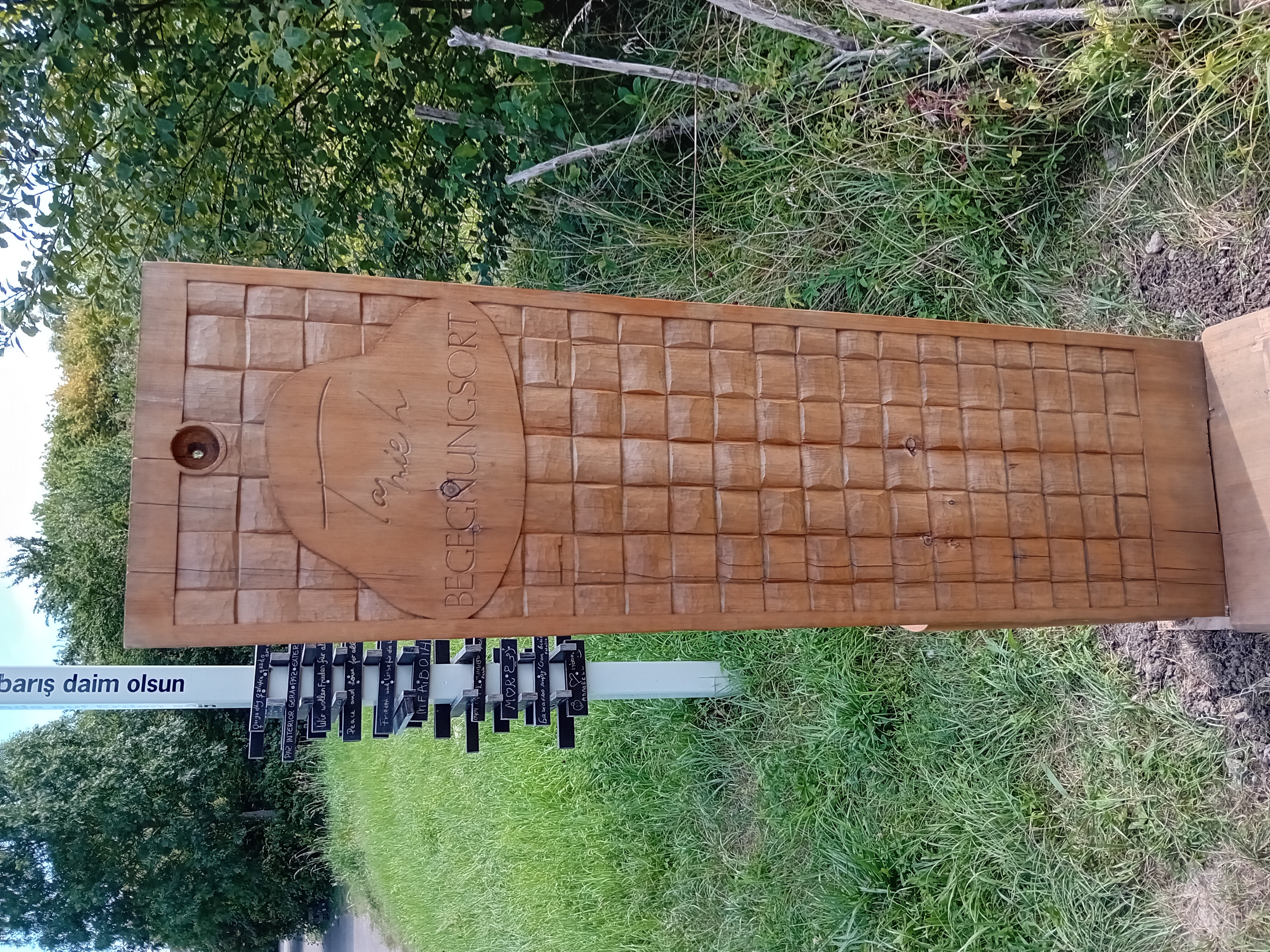 Tamieh hat Wort gehalten: Die besondere Bank ist wieder schön und steht gut verankert an ihrem Platz neben der TamieH Friedensstele, welche beim Fest der Begegnung 2023 entstand und mit Friedensbotschaften vieler verschiedener Sprachen geschmückt ist und dem kleinen Ahornbäumchen vom TamieH-Bauhütten-Richtfest. Die drei Freunde stehen am Fußweg zwischen der Friederich-Bergius-Straße und der Burgbergstraße, am Rande des Grundstückes auf dem aktuell die TamieH-Bauhütte entsteht. Gegenüber befindet sich der Klärteich der Stadtwerke Crailsheim.